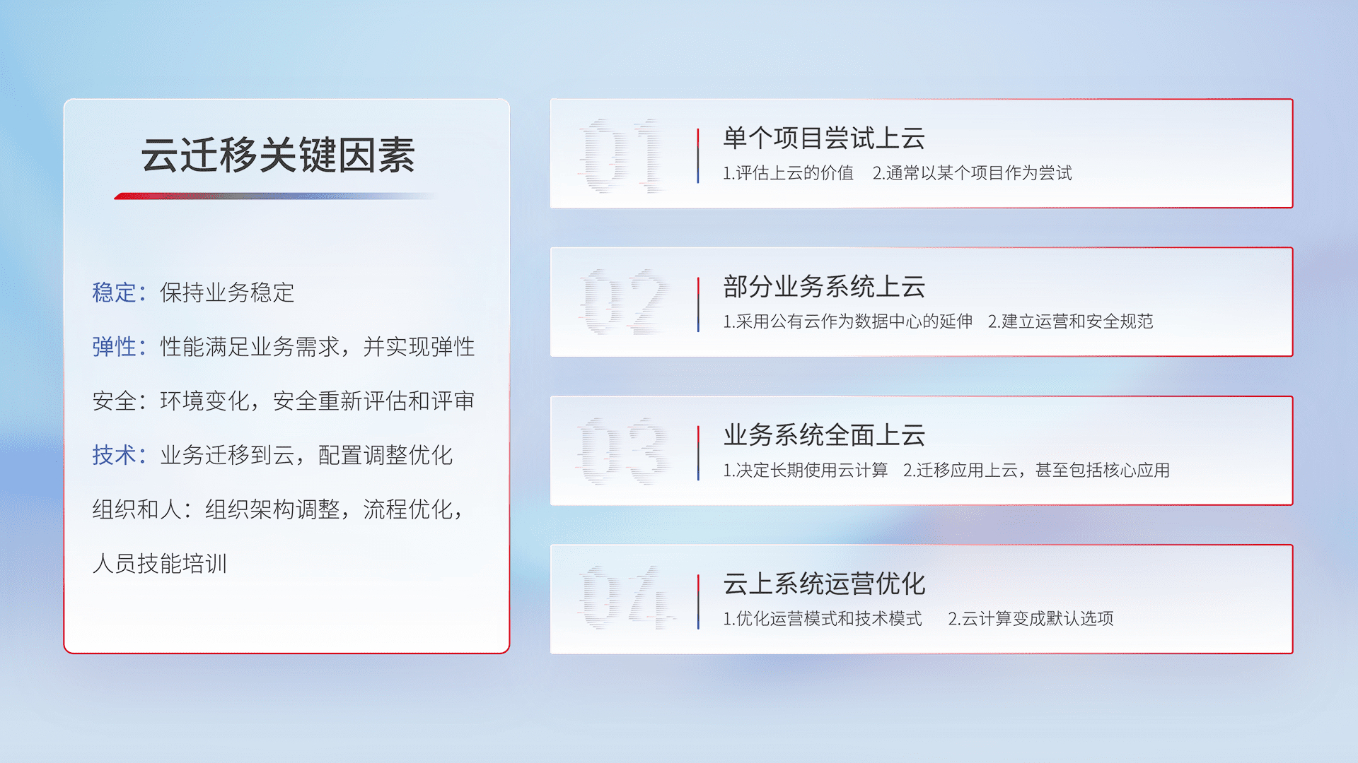 结合实际业务,,从规划设计、、、云平台选型、、云原生改造、、、、数据迁移、、集成交付,,,迁移全过程为客户识别最佳上云路径,,,,做好风险识别管理,,,,设计网络架构、、、身份权限、、、、安全审计合规、、操作审计、、、日志审计、、监控告警策略、、、多站点容灾设计等,,,对云上基础设施进行整体规划,,提升IT治理水平,,以满足弹性、、高可用、、、、高性能的需求。。