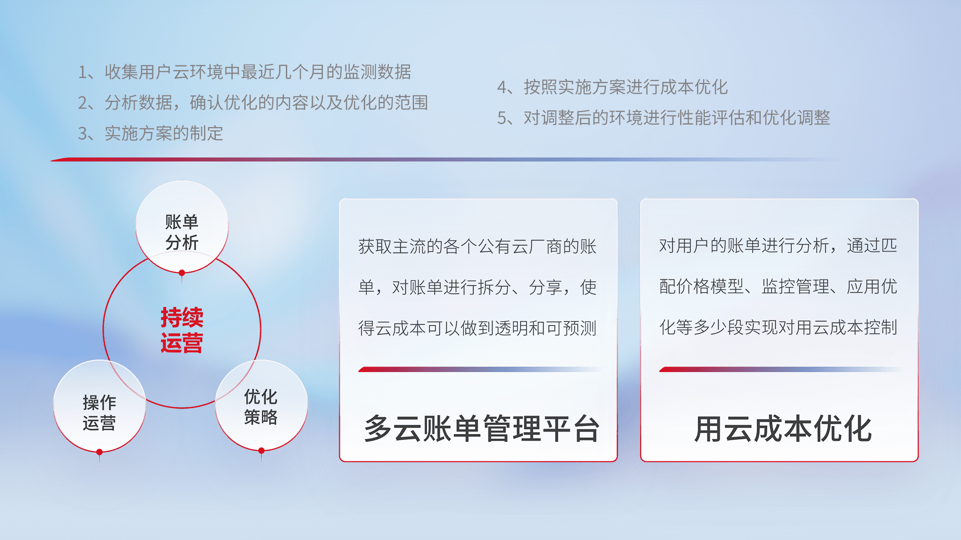 通过多云纳管,,,,以统一的资源数据模型把客户的云资源进行抽象和封装,,,进而实现对多云资源的统一操作,,,保障云资源管理的可靠性、、稳定性与可用性。。。。量身定制化运维内容,,,,配置、、、、开发运维、、补丁管理、、、、备份、、监控、、认证和访问管理、、审计和日常巡检等,,保障在用云过程中的可靠度,,,,稳定度以及高可用率。。。。